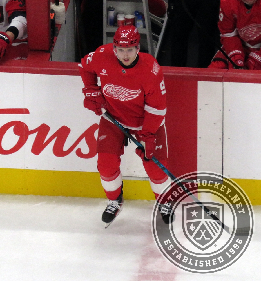 Marco Kasper of the Detroit Red Wings skates near the boards during a game against the Carolina Hurricanes.