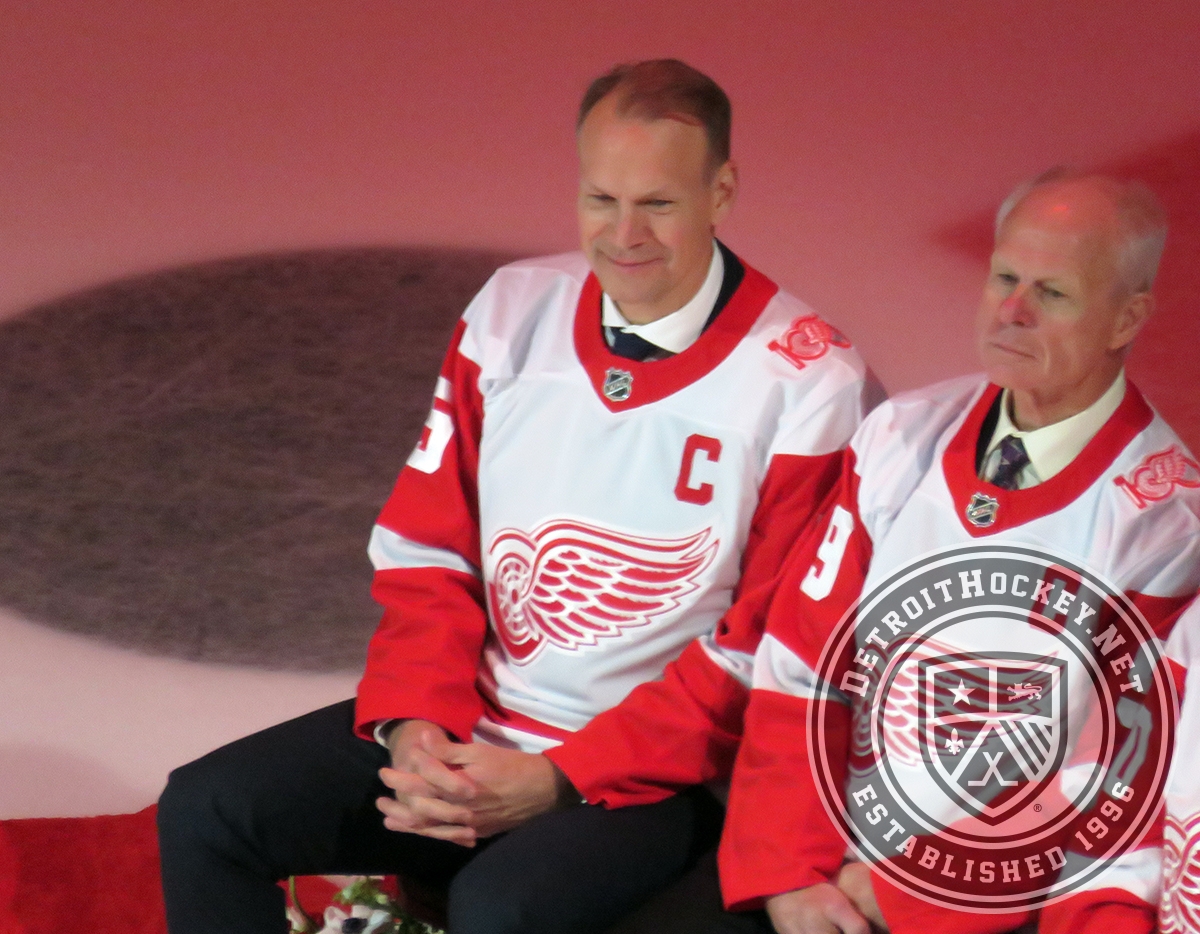 Nicklas Lidstrom and Mark Howe watch Sergei Fedorov speak during Fedorov's jersey retirement ceremony.