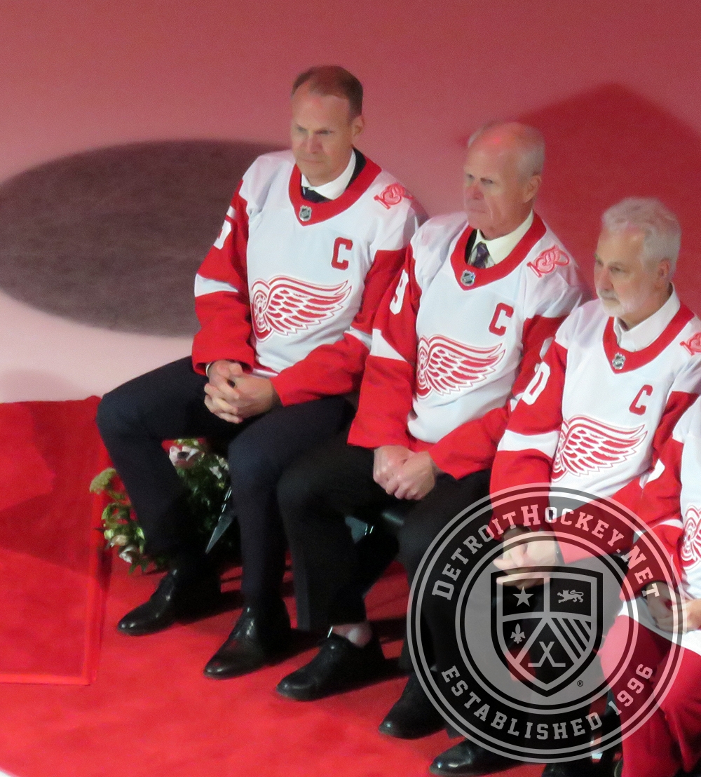 Nicklas Lidstrom and Mark Howe sit with family representatives of other Red Wings legends during Sergei Fedorov's jersey retirement ceremony.