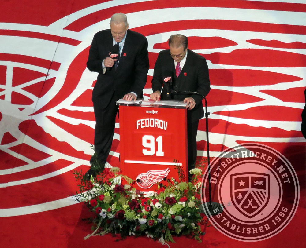 Red Wings television commentators Mickey Redmond and Ken Daniels speak at Sergei Fedorov's jersey retirement ceremony.