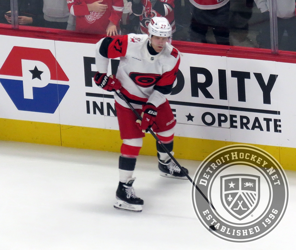 Nikolaj Ehlers of the Carolina Hurricanes skates during pre-game warmups before a game against the Detroit Red Wings.