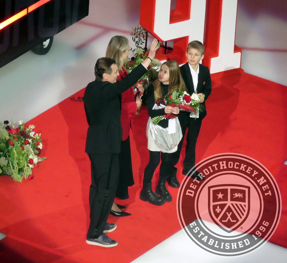 Sergei Fedorov stands with his family and waves to the crowd at the end of his jersey retirement ceremony.