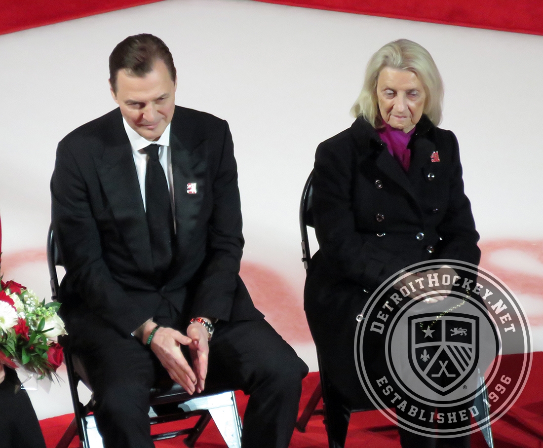 Sergei Fedorov sits next to Red Wings owner Marian Ilitch at Fedorov's jersey retirement ceremony.