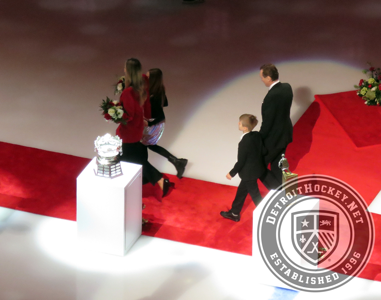 Sergei Fedorov and his family walk past some of the trophies he won over his career during his jersey retirement ceremony.