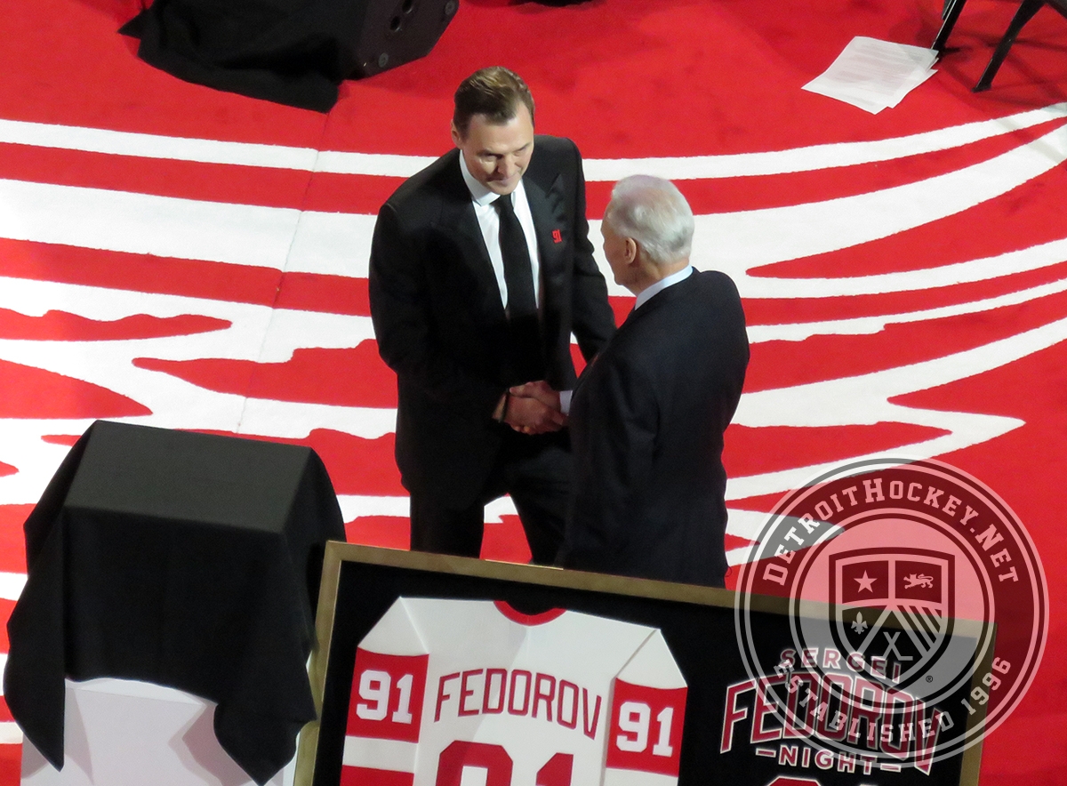 Sergei Fedorov and Mickey Redmond shake hands at Fedorov's jersey retirement ceremony.
