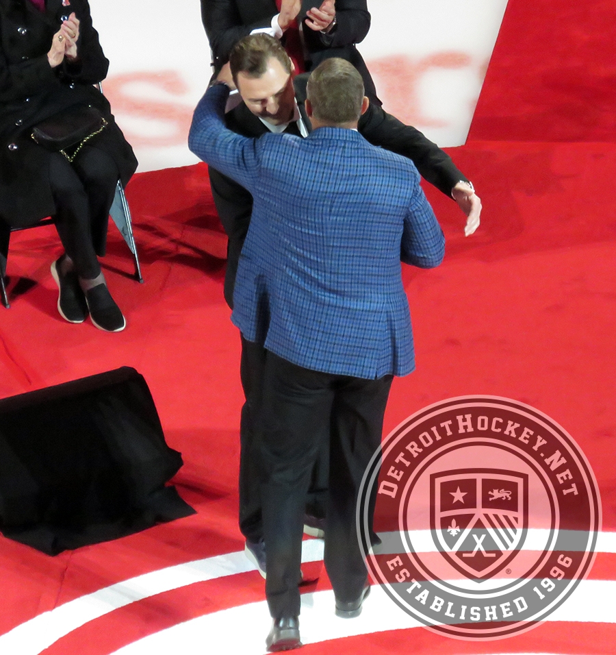 Sergei Fedorov and Steve Yzerman hug before Fedorov speaks at Fedorov's jersey retirement ceremony.