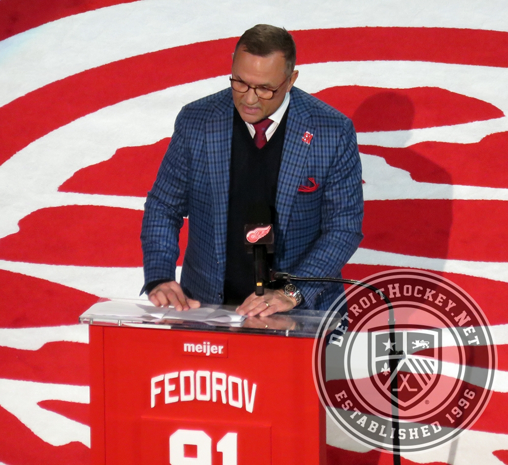 Steve Yzerman stands at the podium to speak during Sergei Fedorov's jersey retirement ceremony.