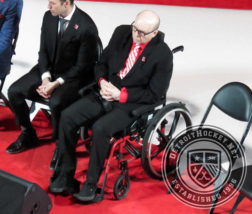 Vladimir Konstantinov sits on the stage at Sergei Fedorov's jersey retirement ceremony.