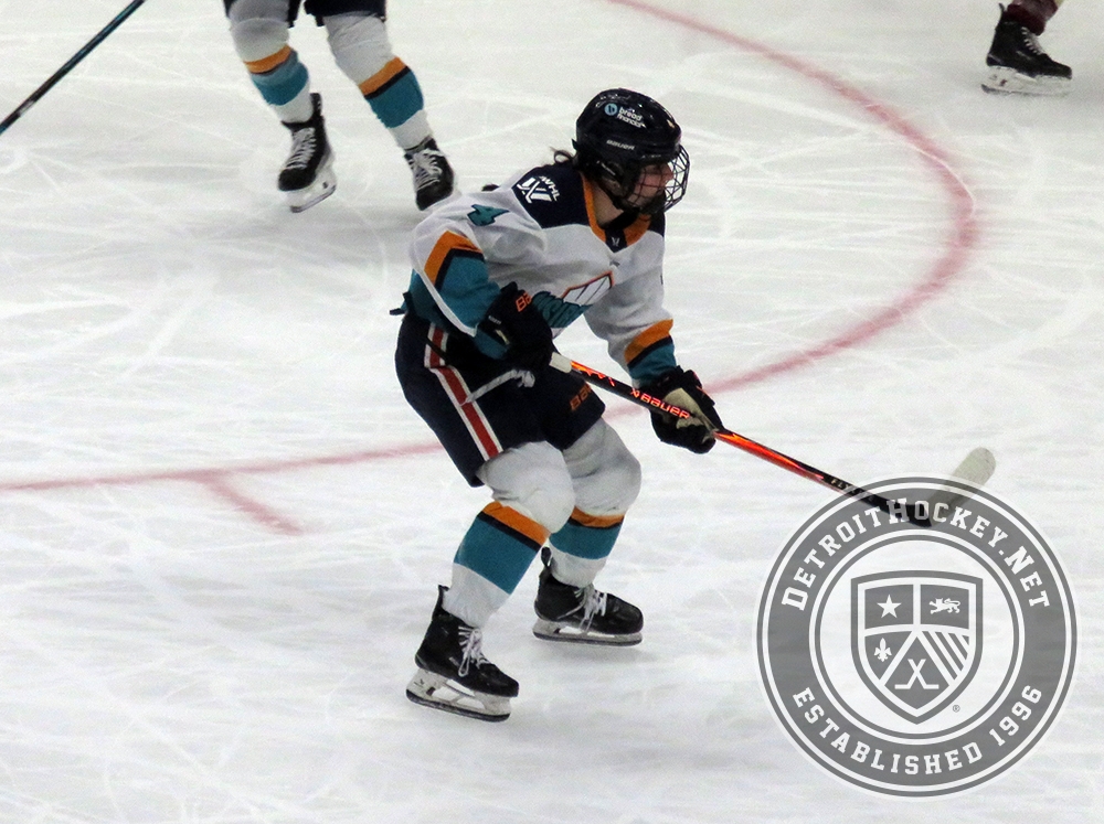 Ellie Hartje of the New York Sirens skates through the slot during the PWHL Takeover Tour Detroit game against the Montreal Victoire.