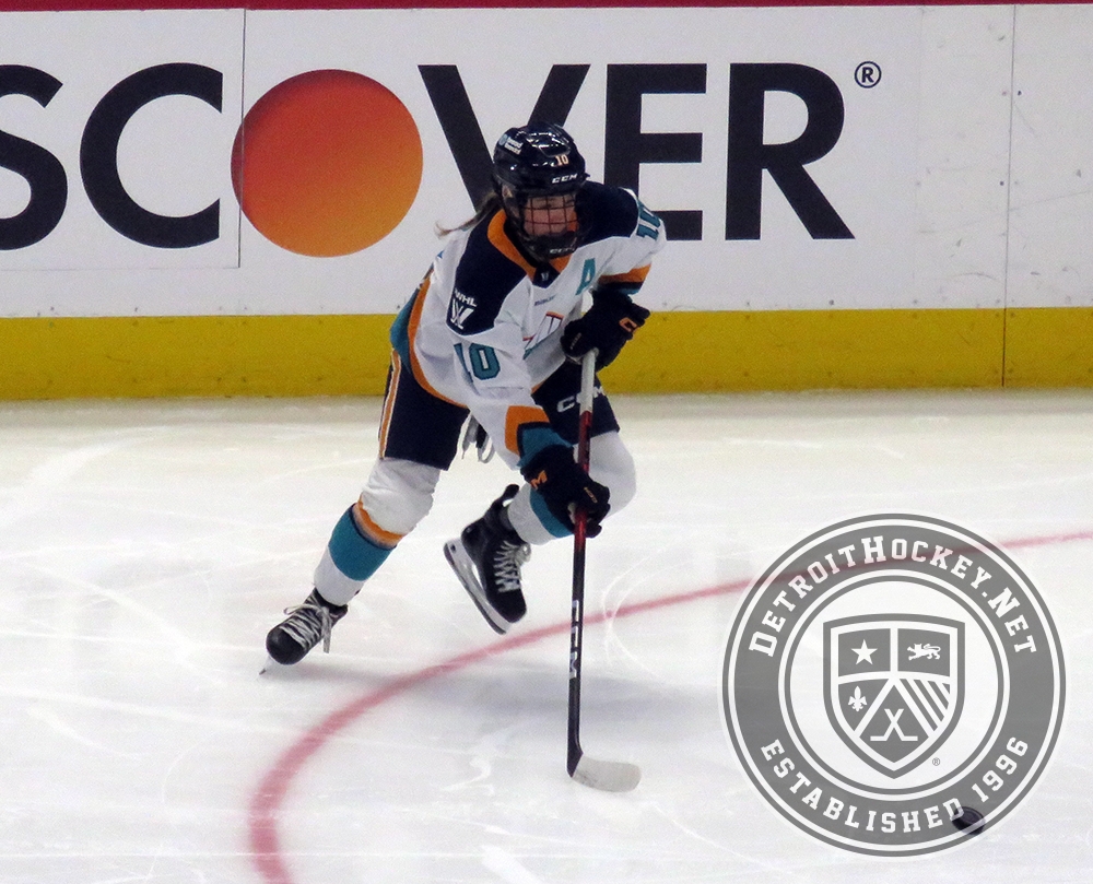Sarah Fillier of the New York Sirens plays the puck during the PWHL Takeover Tour Detroit game against the Montreal Victoire.