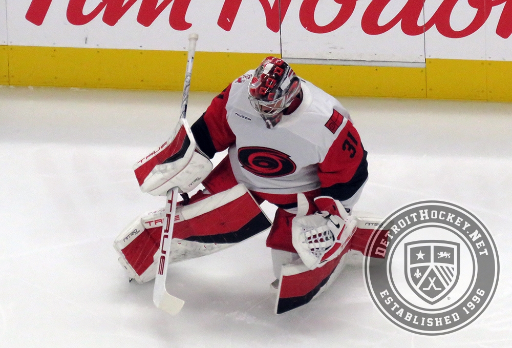 Frederik Andersen of the Carolina Hurricanes stretches in his crease at the start of the second period of a game against the Detroit Red Wings.