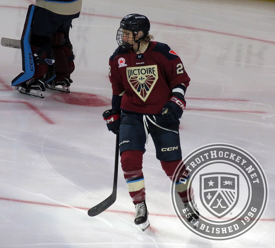 Catherine Dubois of the Montreal Victoire skates across the ice as the first star of the PWHL Takeover Tour Detroit game against the New York Sirens.