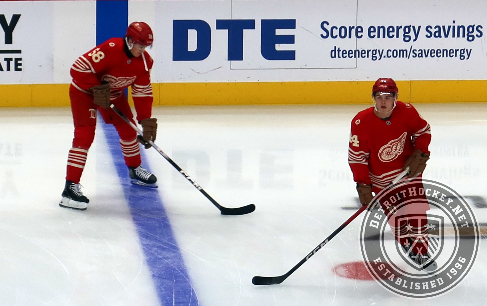 Emmitt Finnie and Axel Sandin-Pellikka of the Detroit Red Wings skate at the blue line during pre-game warmups before a game against the Montreal Canadiens.