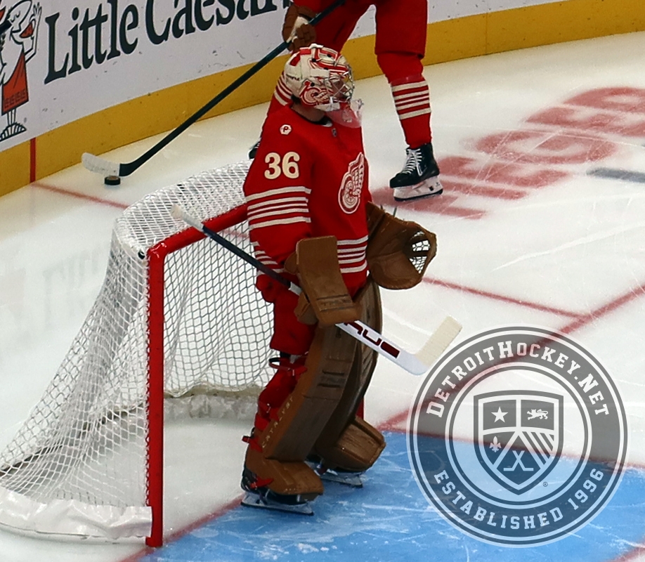 John Gibson of the Detroit Red Wings comes out to the top of his crease during pre-game warmups before a game against the Montreal Canadiens.