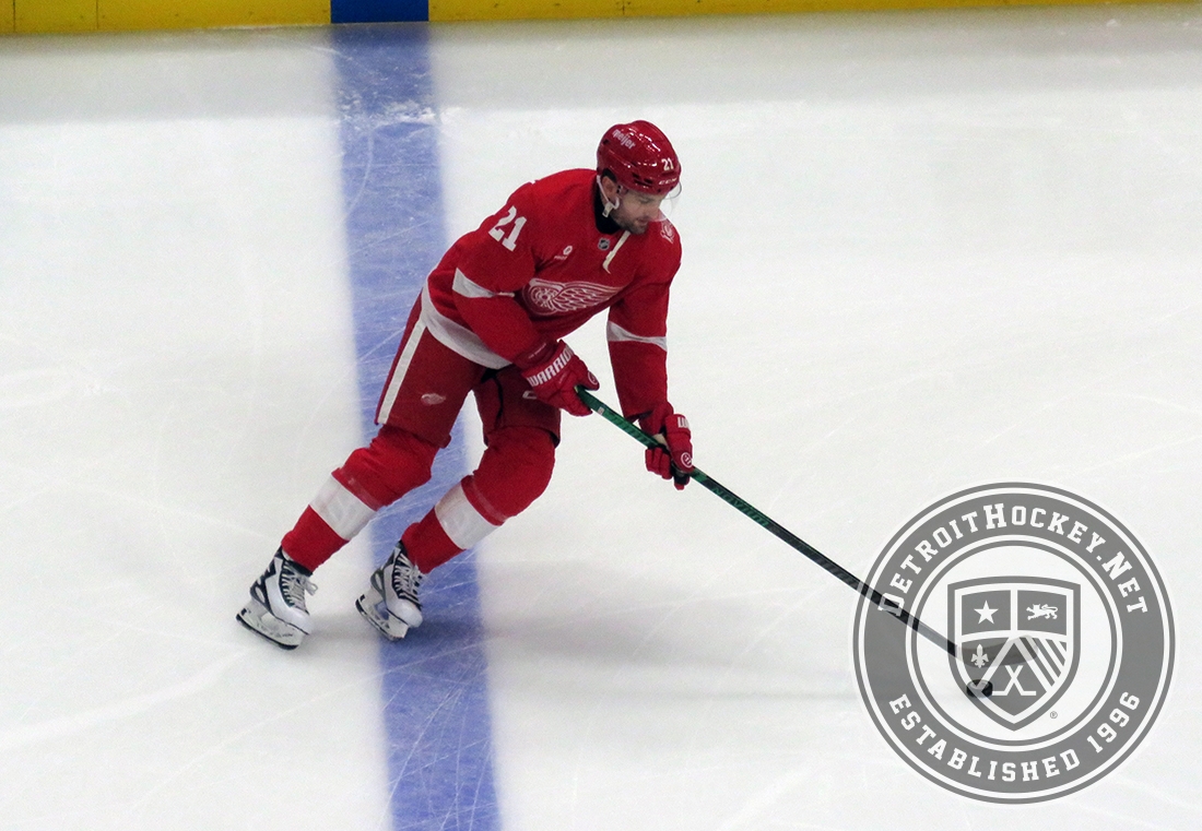 James van Riemsdyk of the Detroit Red Wings skates across the blue line during pre-game warmups before a game against the Carolina Hurricanes, wearing a customized Sergei Fedorov jersey and white skates in honor of Fedorov's jersey retirement.