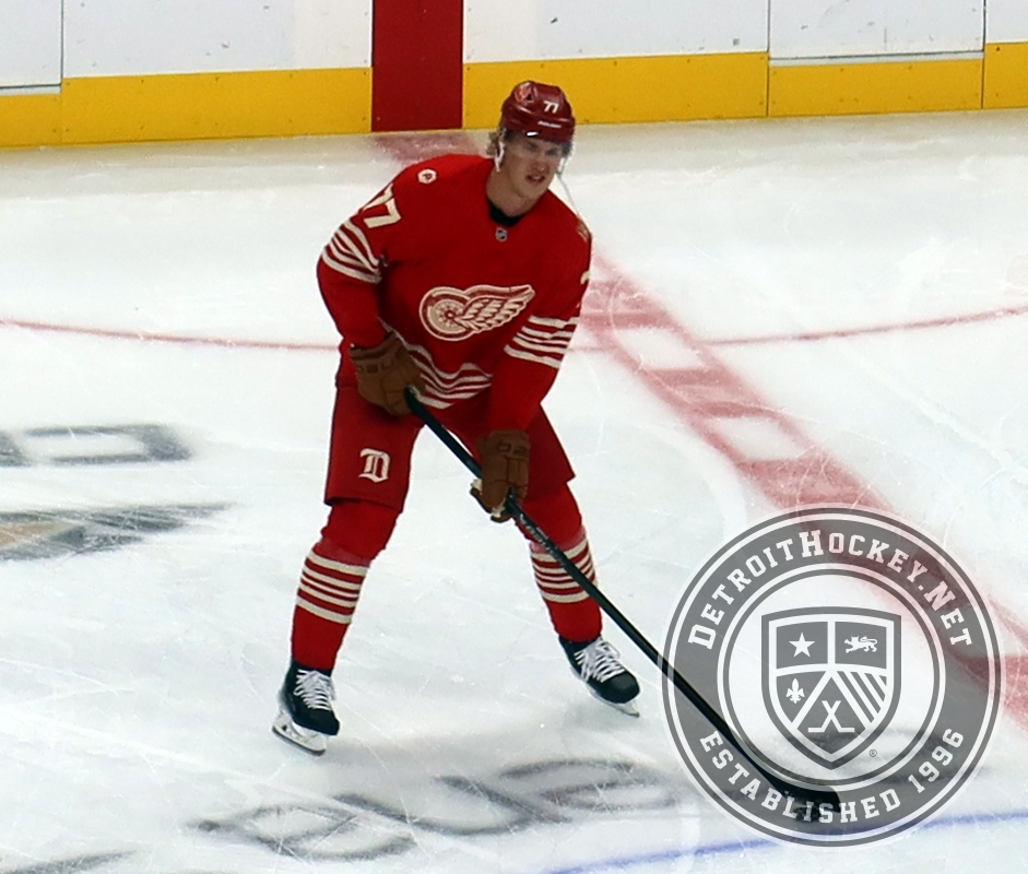 Simon Edvinsson of the Detroit Red Wings skates in the neutral zone during pre-game warmups before a game against the Montreal Canadiens.